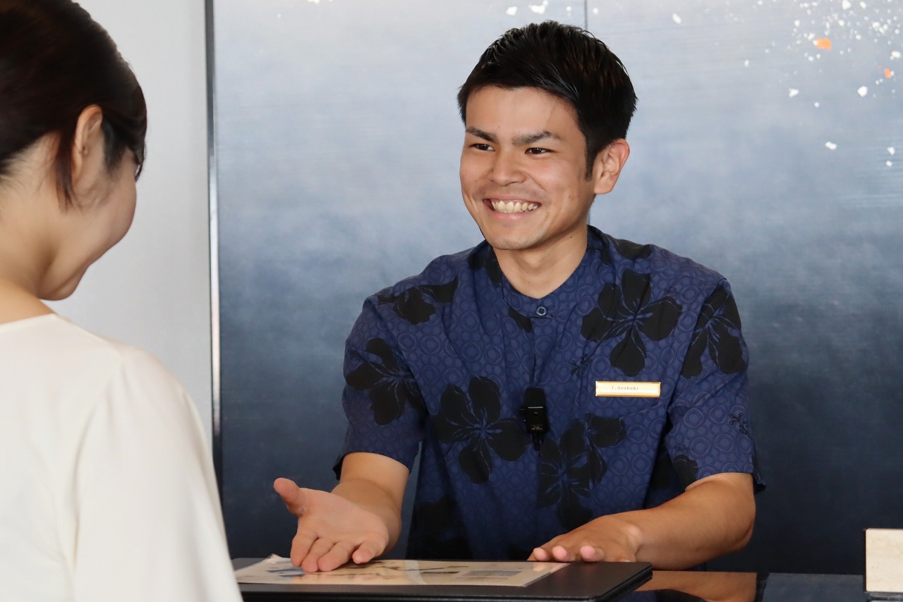 宿泊部 チームリーダー 新垣大河さん (2016年入社 豊見城高等学校 卒業) ●これまでの経歴は? 2016年にハイアットリージェンシー那覇沖縄に新卒新入社員として入社。ハウスキーピング課にて2年間経験を積んだのち、ゲストサービス課へ異動。インチャージ(時間帯責任者)として活躍し、フロントサービス課へ異動。 2022年に琉球ホテル&リゾート名城ビーチの開業メンバーとして抜擢され、フロント&クラブラウンジ課へ配属。2024年にチームリーダーへ昇格。宿泊部のプロフェッショナルとしてマルチに活躍中。 ●仕事のやりがいや心掛けていることは? 年齢や国籍など様々なお客様と出会えることにやりがいを感じています。チェックインの際に自分が担当したゲストは、ご滞在の間も声をかけたり、お話したりしてチェックアウトの時までケアができるように心がけています。お客様とお話するときには、相手の気持ちになって、何を求めているか、どんなことを伝えたいのかを汲み取ることで、なにか自分にできることはないかと考えるようにしています。自分の強みである“笑顔”も大切にしています! ●社内の人間関係について知りたいです。 うちの会社は、“人”が良いと思います。上司や先輩が気にかけてくれて、相談しづらいとか話しにくいと思ったことはないですね。GM(総支配人)や幹部の方々とも直接お話する機会も多いです。今はチームリーダーになって、自分自身が中堅社員として若手社員の育成やチームづくりにも携わるようになったので、尊敬できる先輩のようにみんなを引っ張っていけるような人財になりたいと思っています。