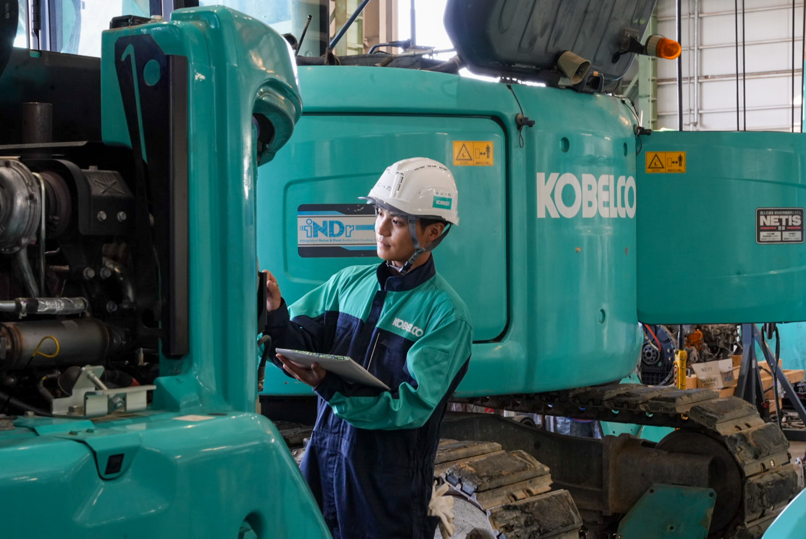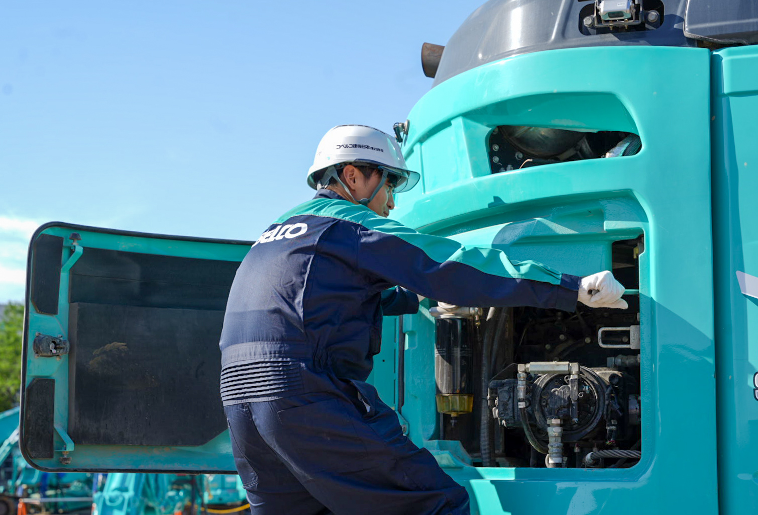 私たちコベルコ建機日本株式会社は、ショベルやクレーンといった建設機械を「販売」したり、「整備(メンテナンス)」したりする会社です。 建設機械は、建物の建設だけでなく、橋や道路をはじめとするインフラの整備や、災害が発生したときの復興事業などの様々な場所で使用されています。まさに縁の下の力持ちといった存在です。 そんな建設機械が安全かつ効率的に動くことができるよう、整備士は日々修理・メンテナンスを行っております。