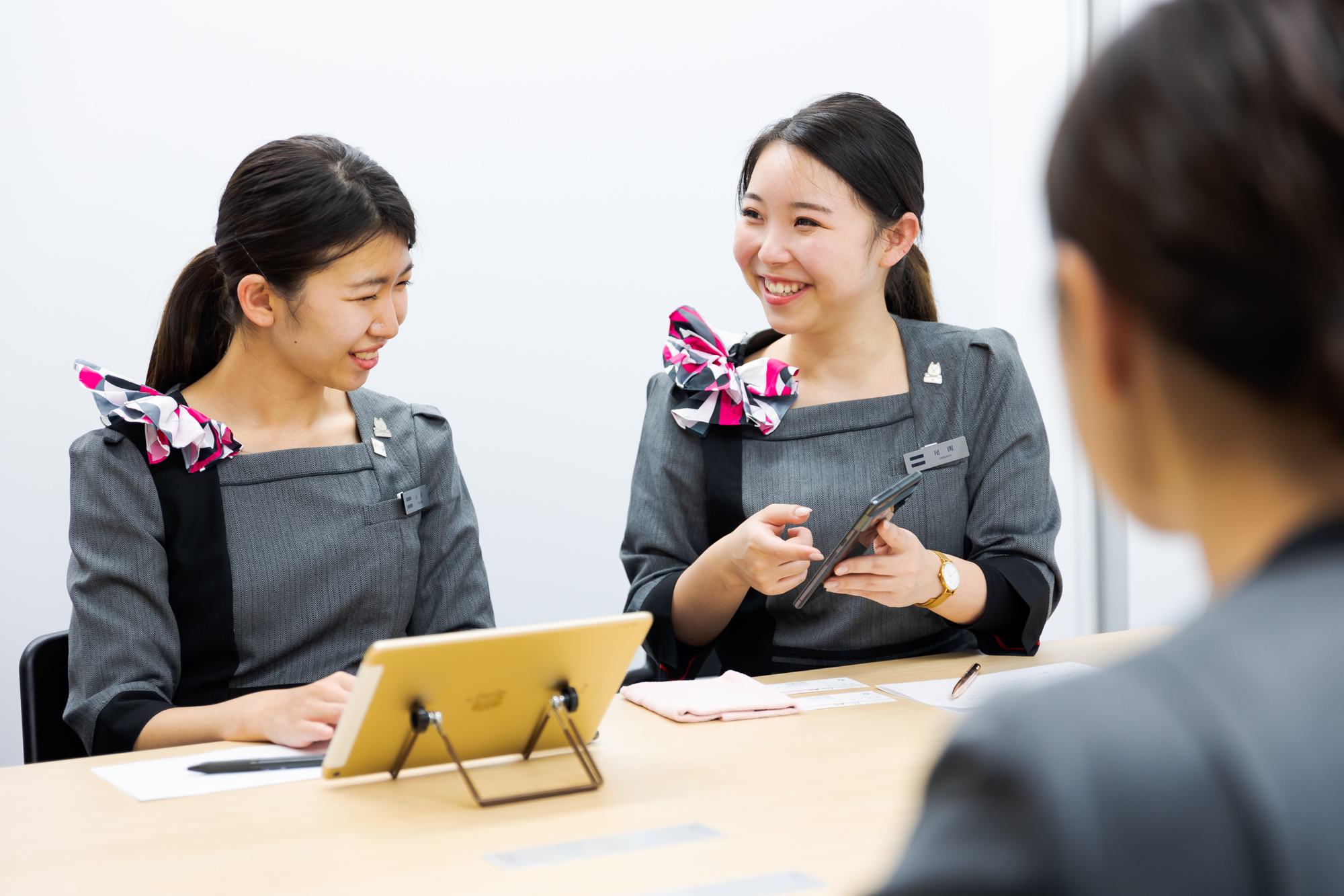 お互いにリラックスした状態でお話したいので、面接はすべて個別としています。 社員一同、皆さんとの出会いを大切にしており、お話しできる事を楽しみにしています。 (写真は面接部屋です*距離近く対話形式で行います) 面接時には疑問や不安解消の為、質疑応答の時間も設けています。 気になる事は何でも気軽に質問してくださいね。