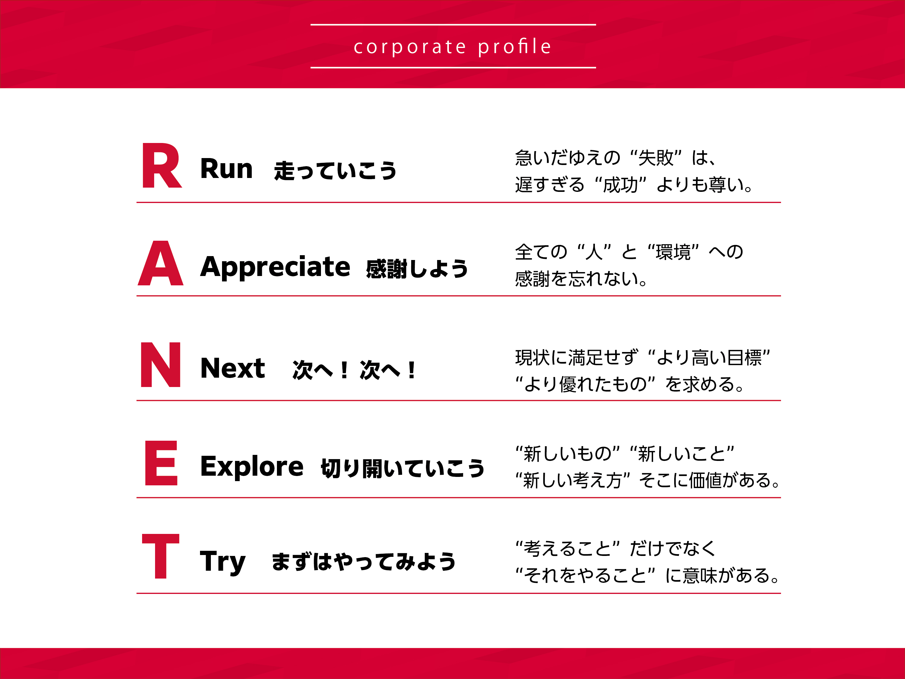 近年のモバイル通信業界の成長・発展は著しく、お客様のニーズは絶えず変化しています。 ニーズを的確に捉え、新しいサービスや価値を創り出すことで、世の中に新しい"ワクワク"を生み出す。 そして、その"ワクワク"をいち早くお届けし、人と未来をつなぐ「架け橋」となる。 私たちは、そんな企業でありたいと考えています。 一人でも多くのお客様の期待に応えられるよう、ラネットグループは日々挑戦し、進化しつづけます。 「R A N E T」を行動指針とし、成長にこだわっている会社です◎ 進化・発展し続ける業界だからこそ、好奇心旺盛に楽しんで進化していきたいと考えています。
