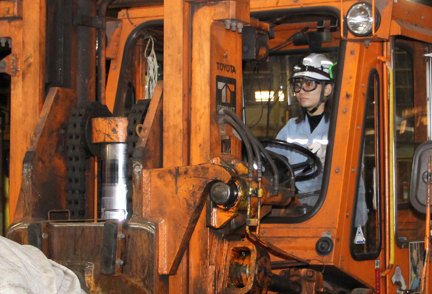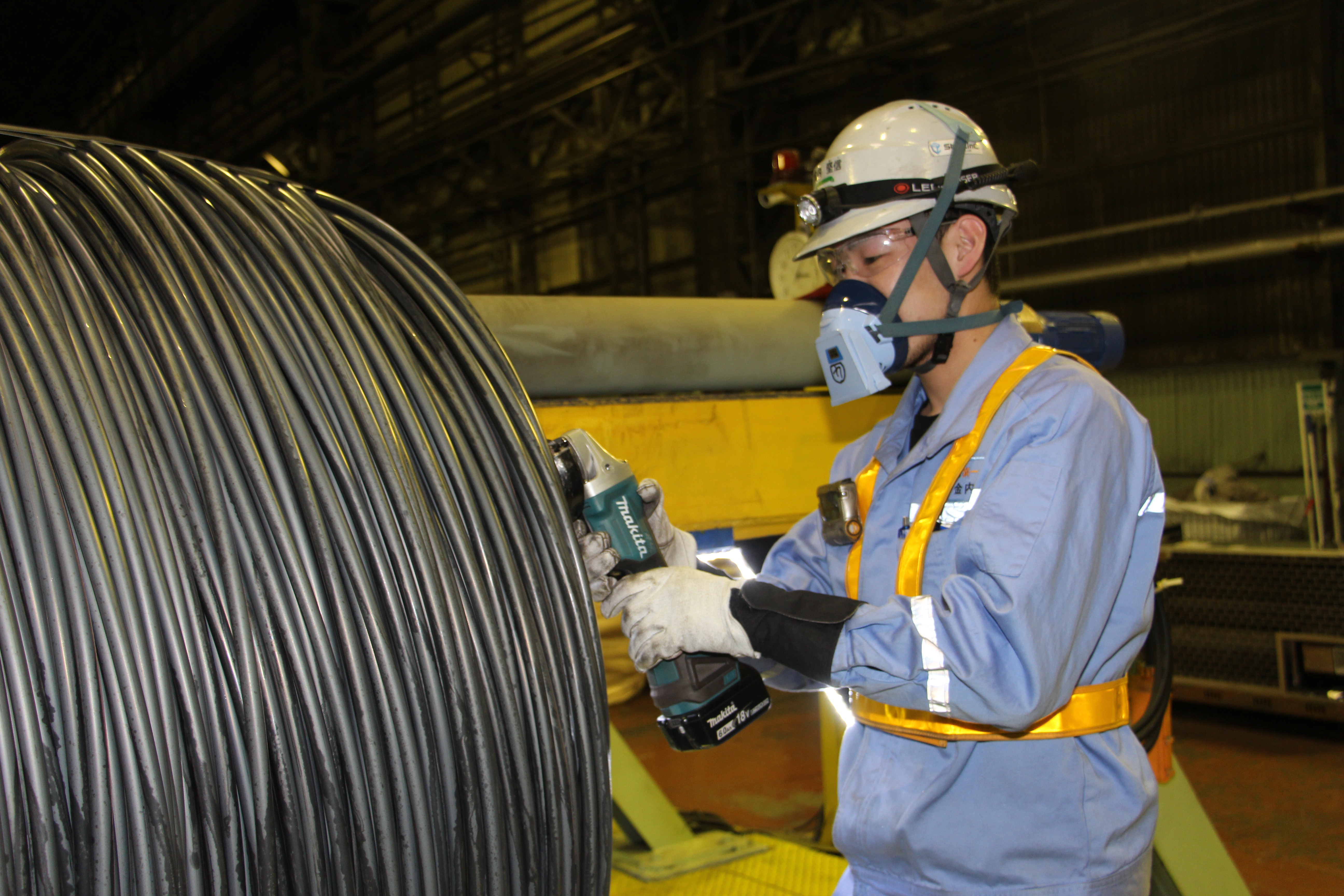 品質検査工 棒鋼、線材製品、半製品の検査、手入れおよび各種運転、工程管理業務 製品の材料となる鉄鋼半製品(ビレット)や圧延されて出来た棒鋼や線材コイルの内部や表面にあるキズをチェックし、グラインダーでキズを削り取るなどの品質管理・保証を行います。 クレーンやフォークリフトを運転し、ビレットや製品を指定された保管場所や加熱炉まで搬送します。 二次加工 加工課では、特殊棒線を焼鈍や皮膜処理などの二次加工をすることによって製品に付加価値をつけます。 火花検査では、製品にハンドグラインダーを当て、それによって発する火花の形状等によって瞬時に鋼種を見極め、判定します。 生産される製品に間違った製品が混じると、重大な品質事故につながりますので、厳しくチェックしています。