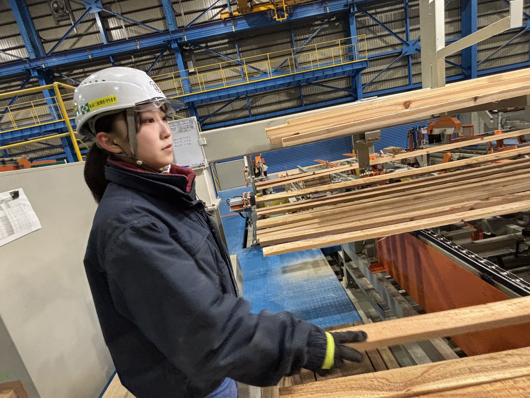 能代工場は中国木材株式会社の最新鋭工場であり、全自動化された生産ラインで設計されています。 秋田県産を中心とした杉の丸太を使って、集成材を製造するお仕事です。 工場内へ投入された丸太は、人が操作することなく全自動で製材されて木板へカットされていきます。 ロボットが1本毎に異なる丸太の太さや形状をデータ化し、どの位置にノコギリを入れると効率的にカットできるかを決めてくれるので、スピーディーにカットしてくれます。 機械トラブルがなければ「監視」や「品質検査」、「出荷」、「選別」業務がメインとなります。 タブレットを活用して、工場内のペーパーレス化も推進しています。