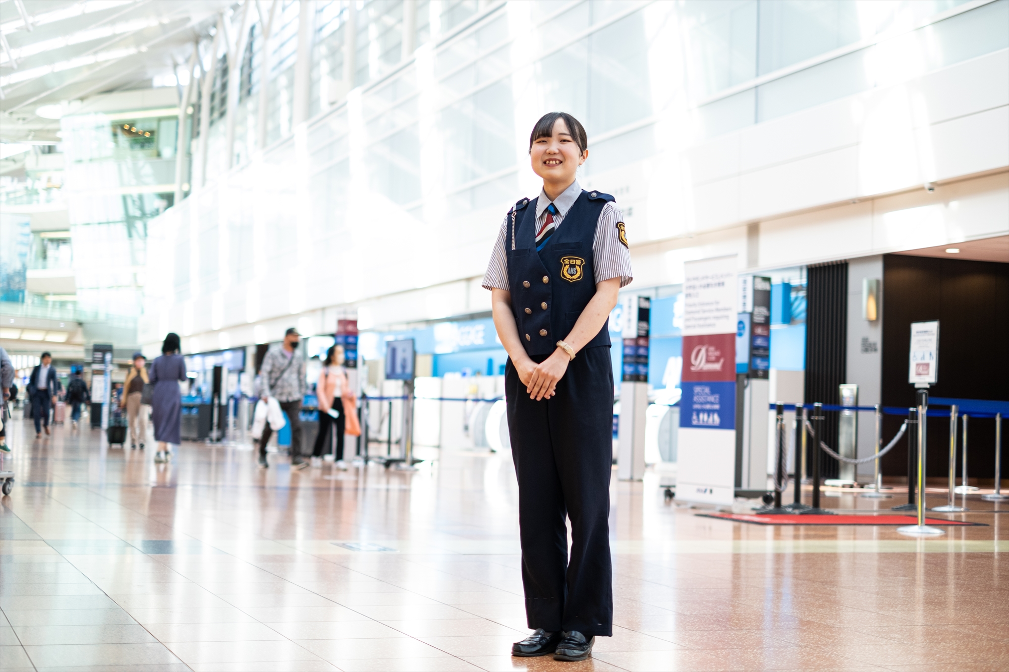 「警備員」と聞くと、屋外で車両や歩行者を誘導している姿を思い浮かべる方が多いかもしれませんが、 全日警の職場は空港や駅、大規模商業施設やオフィスビルなどの屋内が基本です。 空調が効いた快適な環境で働けますのでご安心ください!