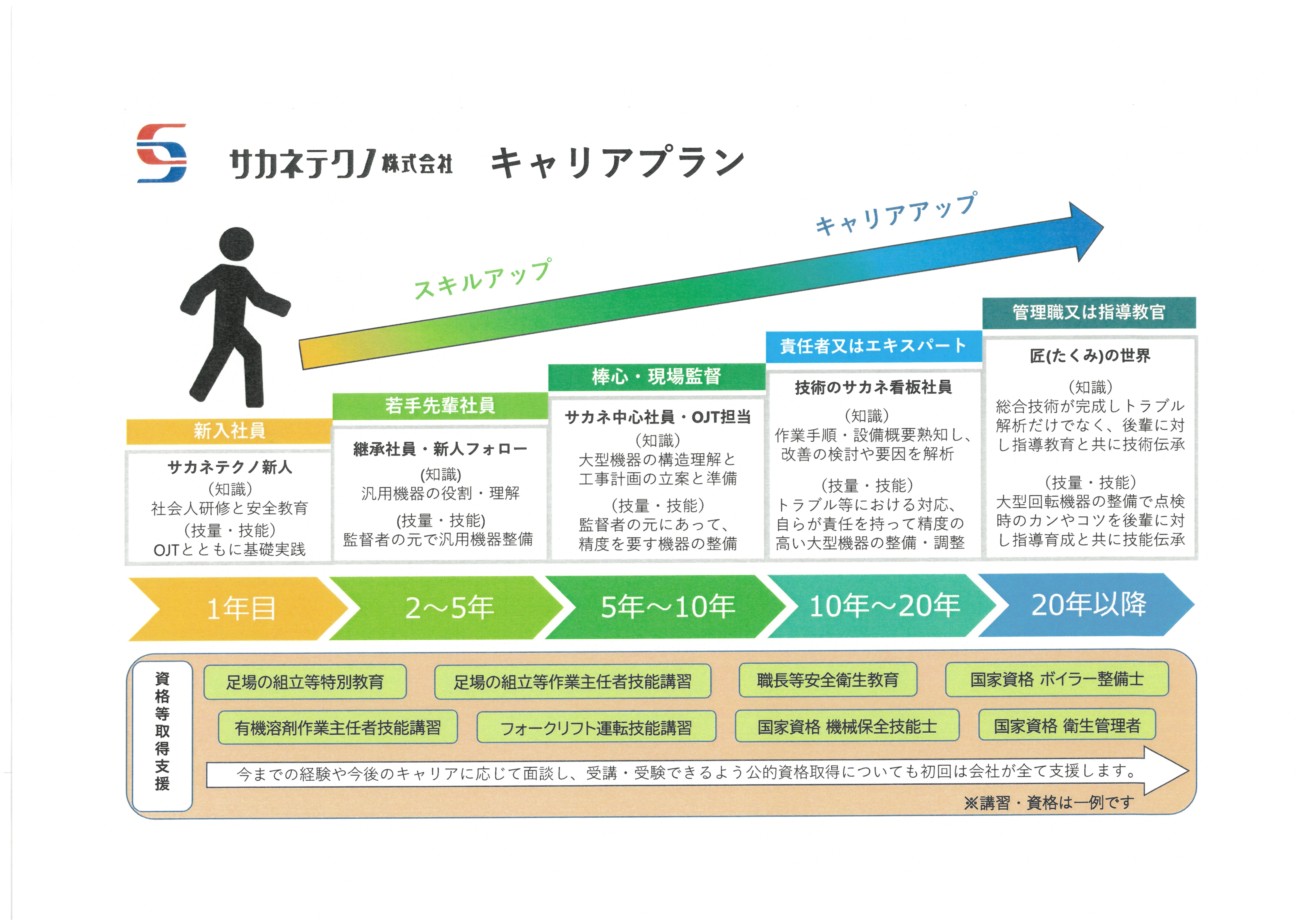 サカネテクノでは社員に対してのキャリアプランがあり、そのプランをベースにした面談を行っています。資格取得なども、会社より出勤扱いで費用も初回負担しております。技術の会社ですので、長期就業により基本給も上がっていき、定年退職後も給料が下がる事はありませんので、安心してゆっくりと技術・技能を身につけることができます。 また、完全週休2日制のため趣味や家族との時間も多く作れるのが社員にとって大きな魅力となっています。
