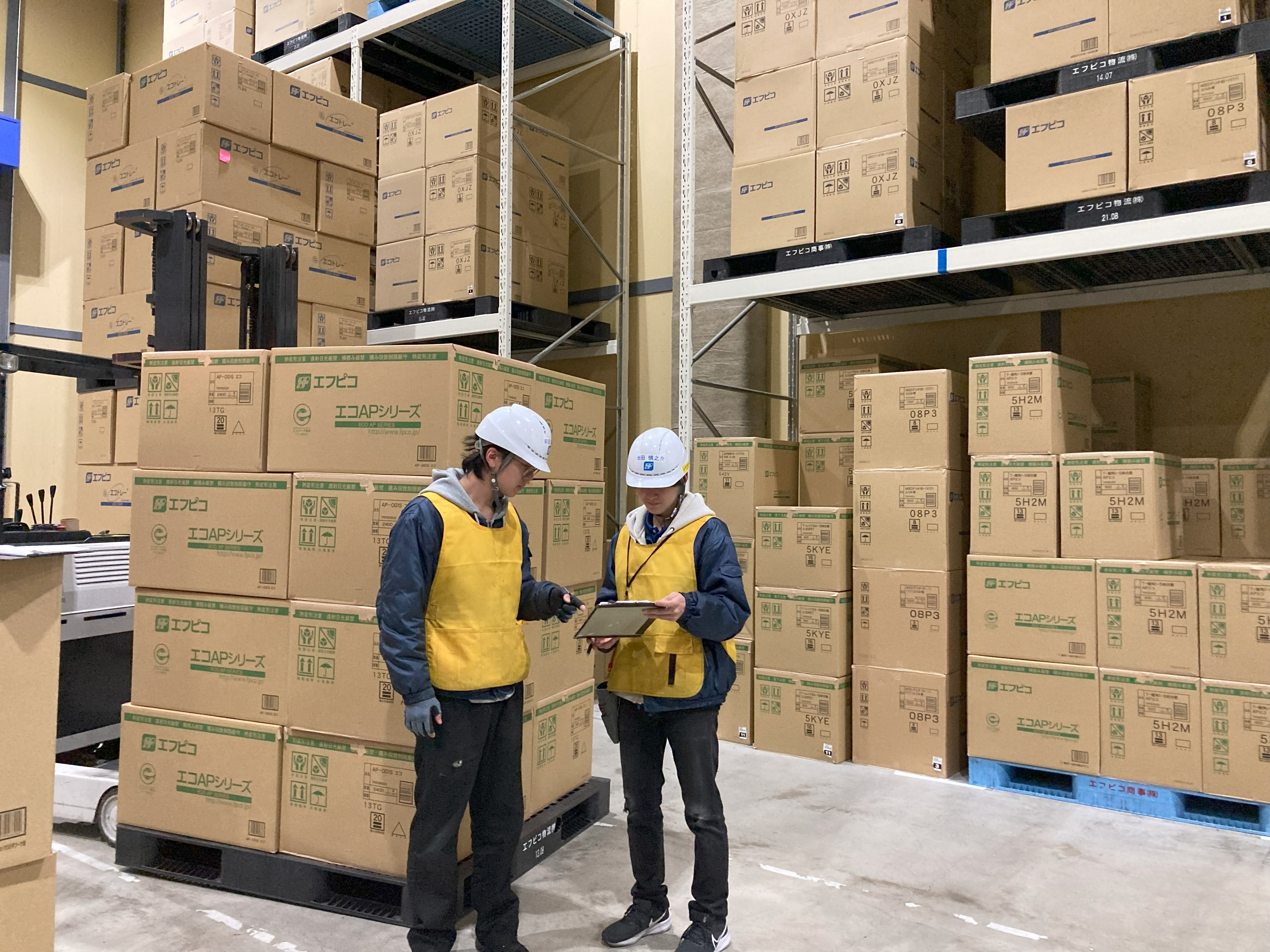 フォークリフトにて製品の入出荷業務を行っています。わからないことは、すぐに先輩スタッフに聞いて、相談できる職場です。 近くに先輩がいない時は、業務用 iPhone の倉庫用専用アプリで相談します。 その時の状況に応じて質問、相談できるので、安心です。 一緒に食事休憩をとり、業務以外でも交流しています。