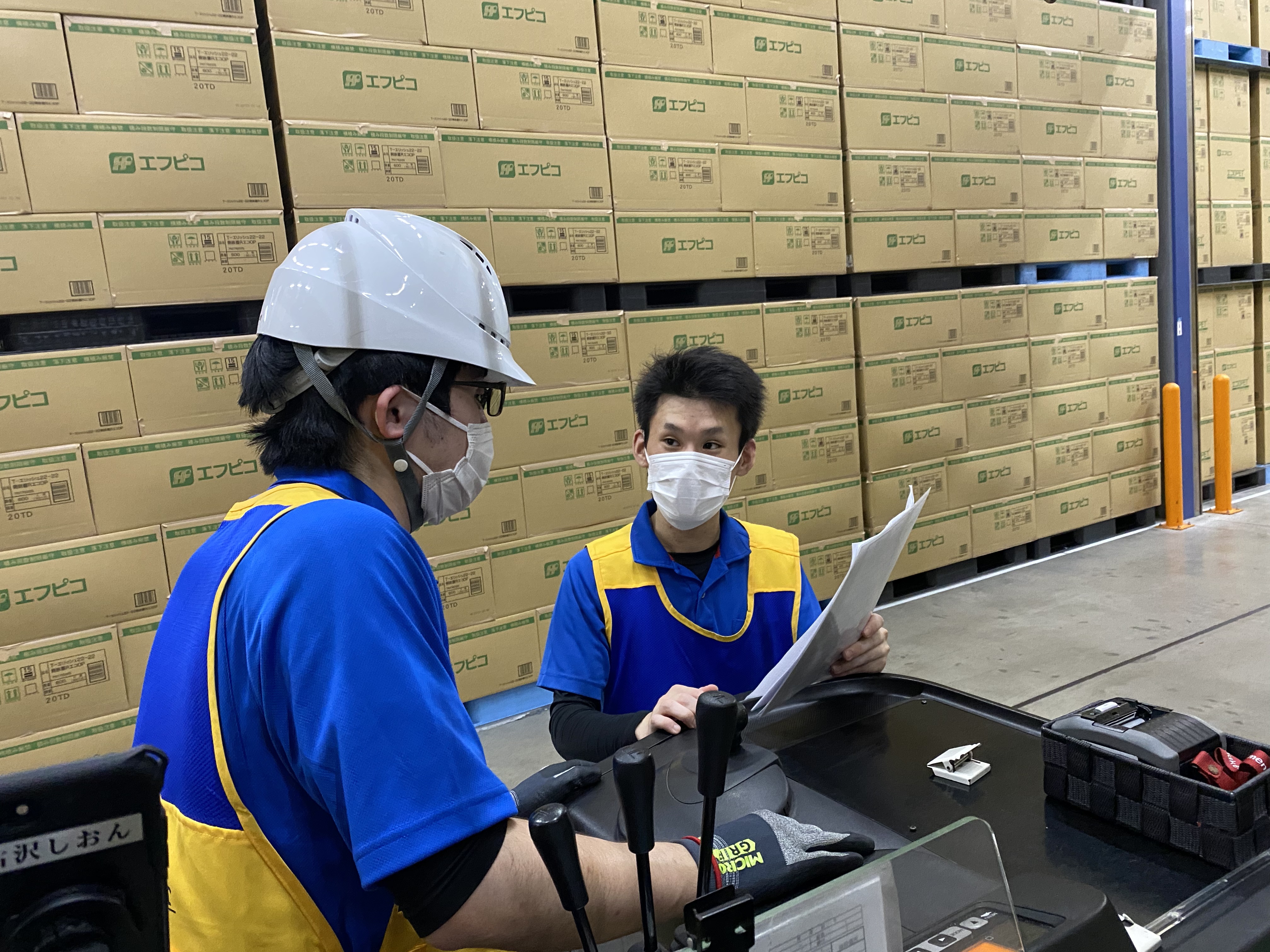 フォークリフトにて製品の入出荷業務を行っています。わからないことは、すぐに先輩スタッフに聞いて、相談できる職場です。 近くに先輩がいない時は、業務用 iPhone の倉庫用専用アプリで相談します。 その時の状況に応じて質問、相談できるので、安心です。 一緒に食事休憩をとり、業務以外でも交流しています。