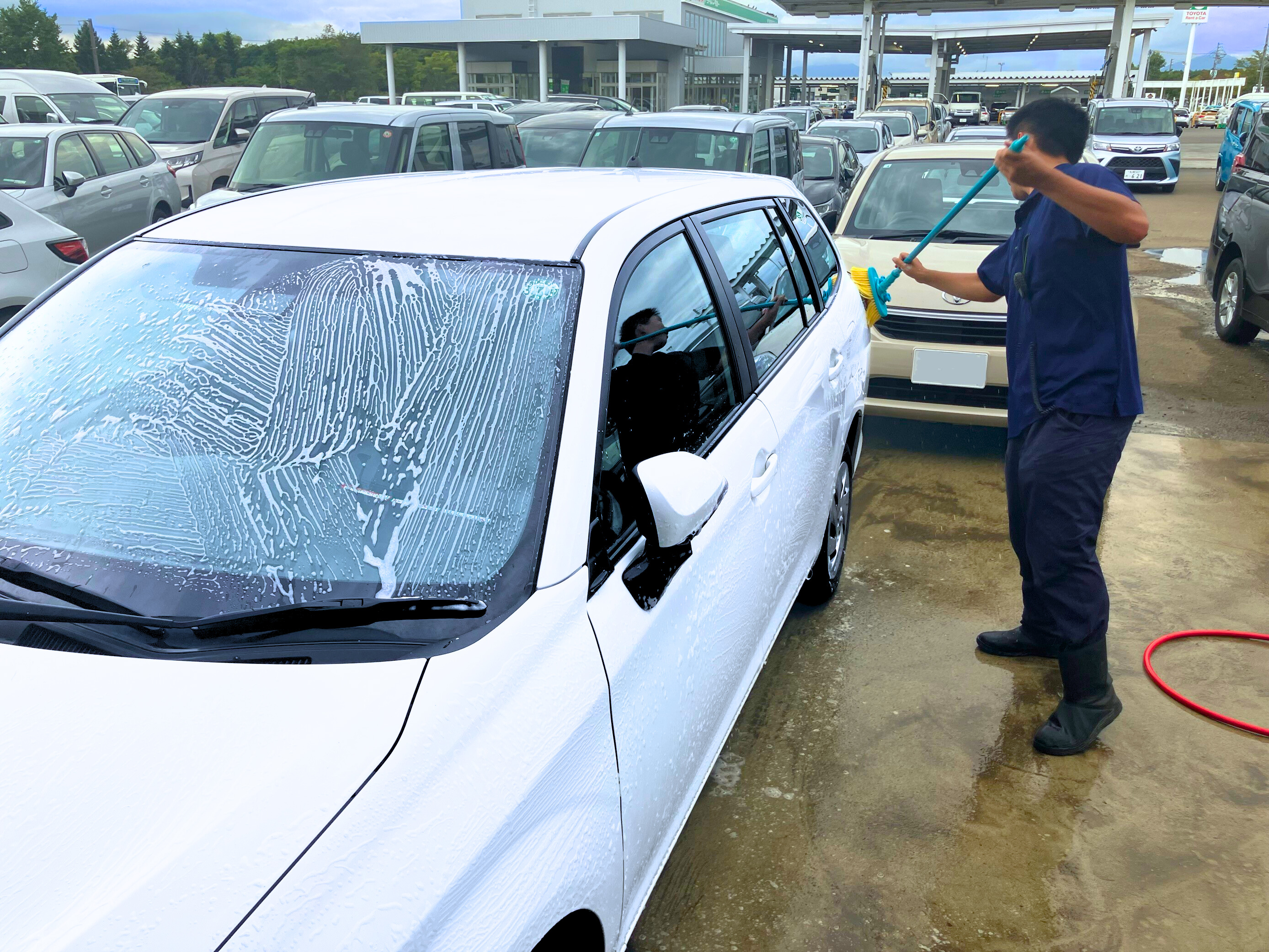 レンタカーショップの仕事は、次のお客様が気持ちよく使えるように車を『準備する』お仕事です♪作業はシンプルな5ステップで、未経験でも安心してスタートできます! 【STEP1:車のキズや状態をチェック】 車両のキズや状態をチェックシートに記入するところから始まります。タイヤやバッテリーなどの確認も行う大切な工程ですが、しっかりサポートを受けながら取り組める環境です。丁寧に確認する力が身につきます。 【STEP2:機器の設定をリセット】 次に、ナビの履歴やBluetoothなどの設定を初期化します。難しい作業はなく、先輩が一から教えてくれるので安心です。 【STEP3:外装の洗車】 洗車をするのは機械♪洗車機に入れる前に、車体についた汚れなどを専用の道具で落とす作業が中心で、体を動かしながら働きたい方にぴったり。車がきれいになっていく達成感も味わえますよ! 【STEP4:内装清掃】 2人1組で拭き掃除や掃除機がけを行います。細かい部分まで気を配りながら作業を進めるため、きれい好きな方やコツコツ取り組むことが好きな方にぴったり! 【STEP5:出発準備】 最後に、清掃が終わった車を所定の場所へ移動し、出発の準備を整えます。最初は簡単な移動からスタートし、安全第一で進めていきます! どの作業も先輩が丁寧に教えるので、少しずつできることを増やしていければOK!将来的にはすべての工程を覚えていき、できることが増えたら一人前♪その後は長く安定して働ける環境も整っていますよ。未経験からでも始めやすく、車の知識や社会人としての基本も自然と身につくお仕事です。