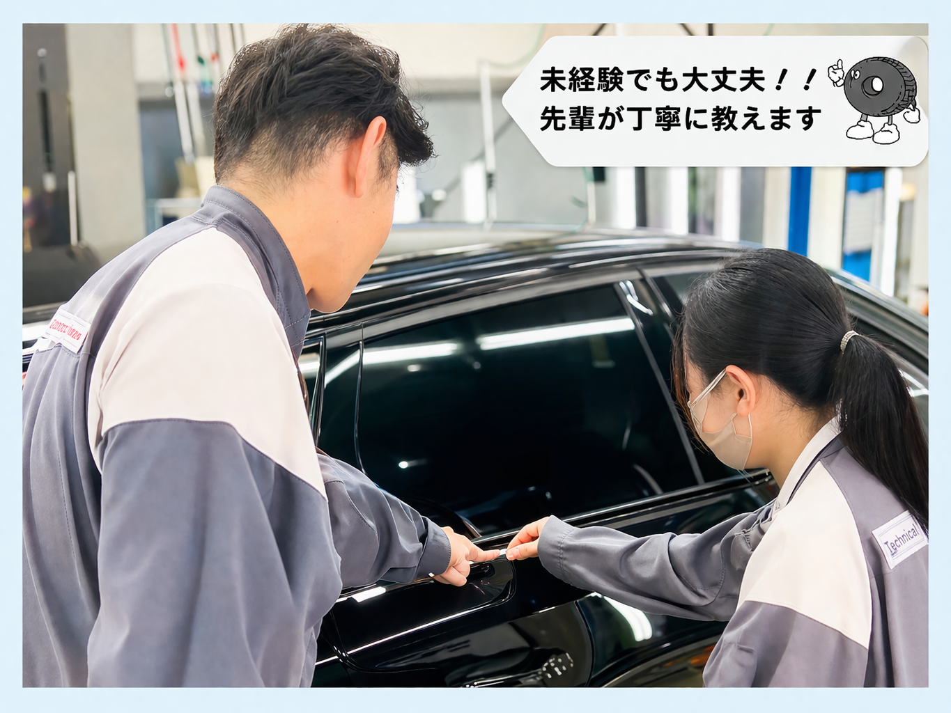 「車には興味がないけど、集中して作業をするのが好き。」「少しだけ車に興味があるけど知識はゼロ。」 そんな理由から当社に入社した社員もたくさんいます。 知識ゼロだった社員も今はプロとして活躍中。新入社員の教育も、そんな先輩社員だからこそ丁寧に研修することの大切さを知っています。まずは車に慣れることから。車の扱い方や、どうしてこの作業が必要なのか。うまく作業をするにはどうしたらいいのか。 一人一人に合ったペースで、マンツーマンで研修をおこなっていきます。