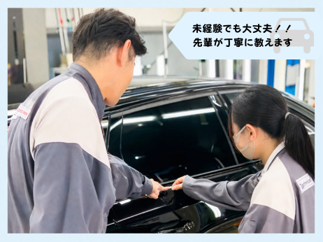 「車には興味がないけど、集中して作業をするのが好き。」「少しだけ車に興味があるけど知識はゼロ。」 そんな理由から当社に入社した社員もたくさんいます。 知識ゼロだった社員も今はプロとして活躍中。新入社員の教育も、そんな先輩社員だからこそ丁寧に研修することの大切さを知っています。 まずは車に慣れることから。新車の扱い方や、どうしてこの作業が必要なのか。うまく作業をするにはどうしたらいいのか。 一人一人に合ったペースで、マンツーマンで研修をおこなっていきます。