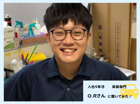 Q. どんな仕事をしていますか? 新車の物流工場で、オプション部品の取り付けを行っています。当社ではこの作業を「架装」と呼んでおり、車をより便利で魅力的に仕上げる仕事です。 Q. 入社の決め手は何でしたか? 「架装」という聞き慣れない仕事に興味を持ったのがきっかけです。ピカピカの新車を扱い、手際よく作業する先輩の姿がとてもかっこよく、自分もやってみたいと思いました。 Q. 職場の雰囲気はどうですか? コミュニケーションが取りやすく、わからないことはすぐに聞ける環境です。お互いに教え合いながら仕事を進めています。 Q. 休日はどのように過ごしていますか? 仕事で身につけた知識を活かして、自分の車をカスタマイズしています。車が好きな人には、より楽しめる仕事だと思います。